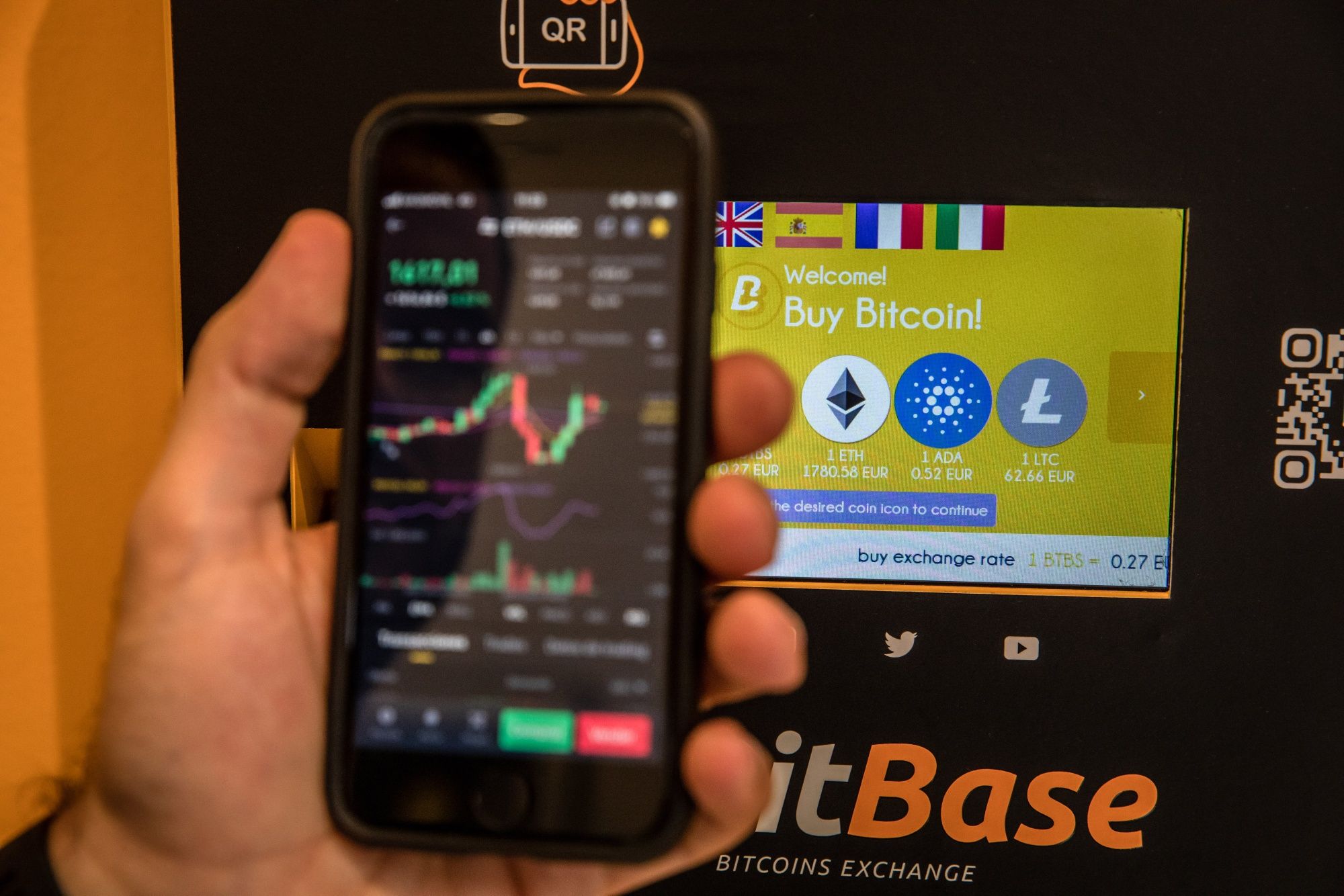 A customer checking an Ethereum price chart on a mobile phone at a cryptocurrency exchange in Barcelona, Spain.