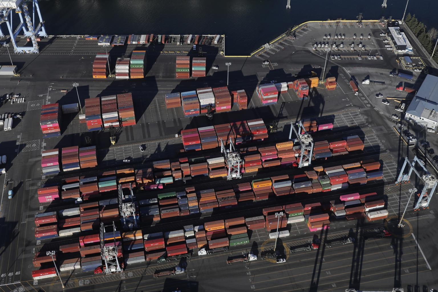 In this photo taken on March 5, 2019, cargo containers are staged near cranes at the Port of Tacoma, in Tacoma, Washington.