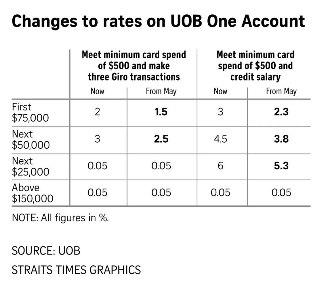 Still, it is the second year in a row that UOB has cut rates on its One Account. Prior to May 2024, the One Account offered up to 5 per cent per annum on deposits up to $100,000.