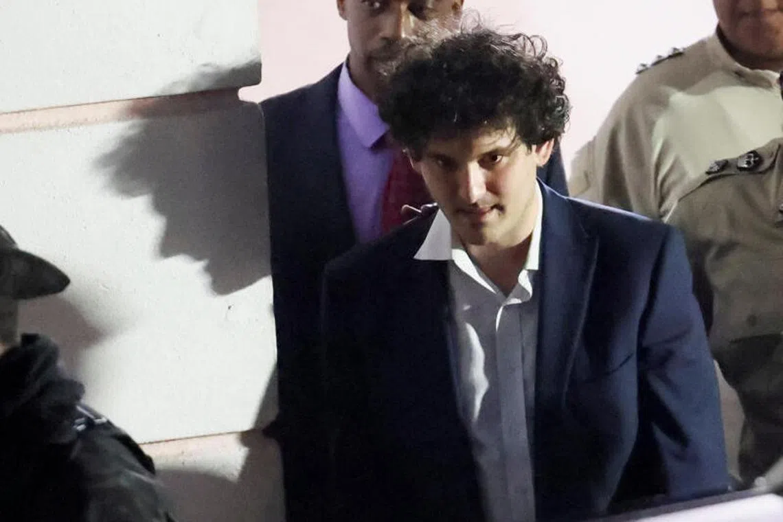 Sam Bankman-Fried is escorted out of the Magistrate Court building after his arrest, in Nassau, Bahamas, on Dec 13, 2022.
