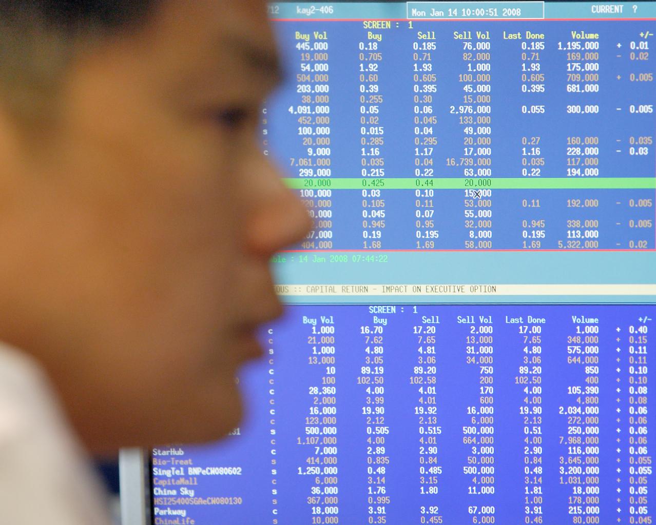 A file picture of a trader watching stock prices. Asian shares tumbled on Wednesday and the safe-haven yen rallied as Chinese stocks remained in a tailspin, shaking investors already rattled by Greece's debt crisis. PHOTO: BLOOMBERG