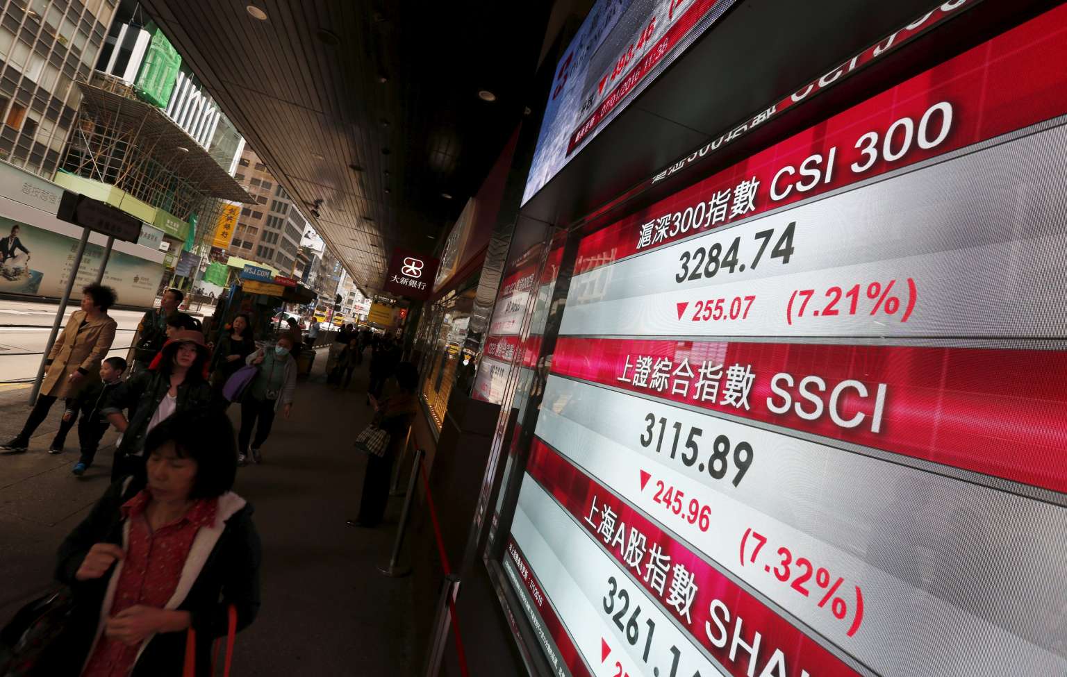 People walking past a panel displaying China stock market indexes in Hong Kong.