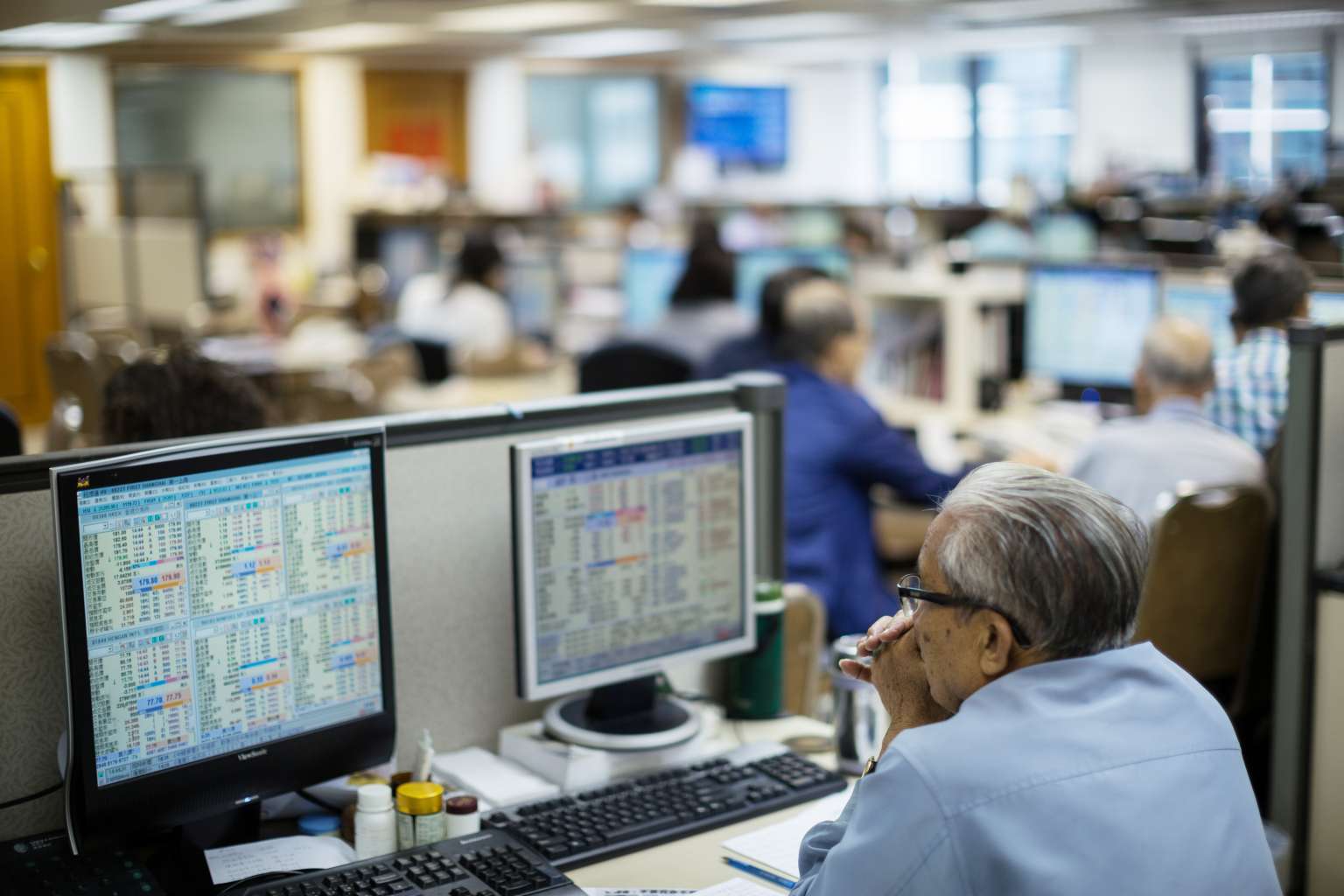 A stockbroker sits in front of screens displaying share prices at a securities brokerage in Hong Kong, China, on Monday, Aug. 24, 2015. PHOTO: BLOOMBERG