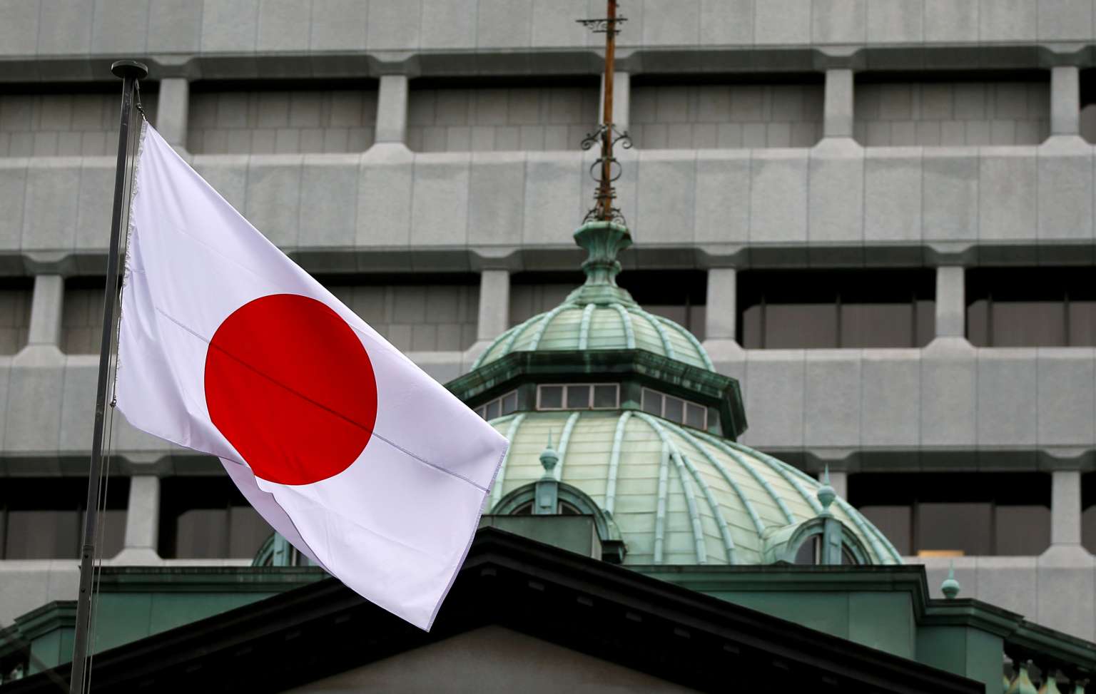 A Japanese flag flutters atop the Bank of Japan building in Tokyo, Japan.