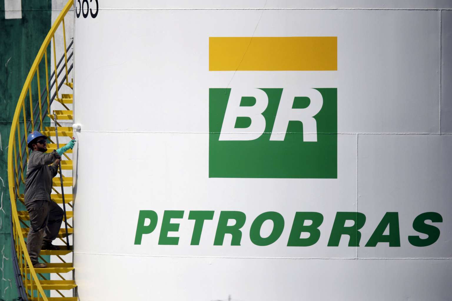 A worker paints a tank of Brazil's state-run Petrobras oil company in Brasilia, Brazil, Sept 30, 2015.