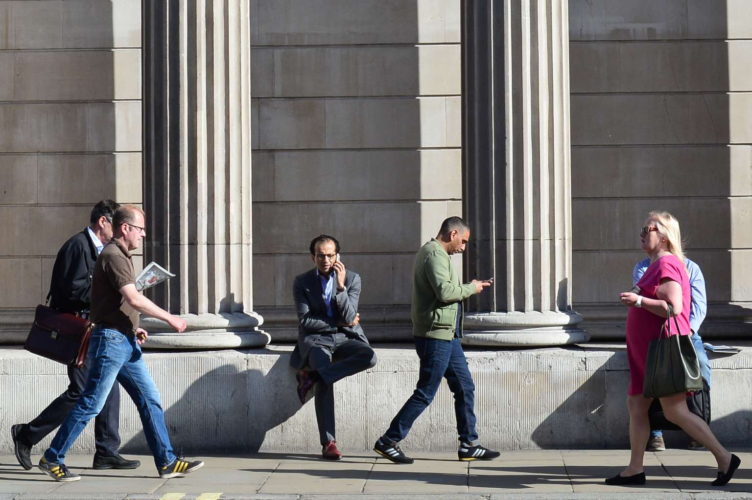 A man speaks on his mobile phone as commuters pass by outside the Bank of England in London, on June 24, 2016.