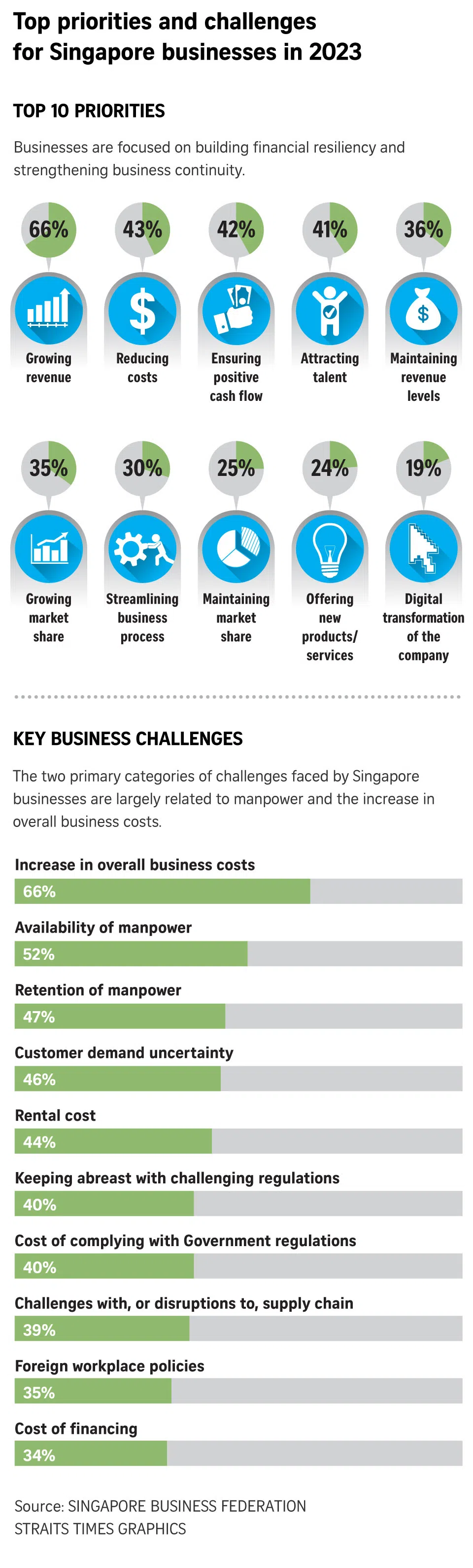 Mr Albert Tsui, executive director of SBF’s advocacy and policy division, said: “While business sentiments are generally on an upward trajectory post-pandemic, most Singapore businesses are approaching 2023 with greater caution on the back of heightened cost pressures and continued manpower challenges. Despite these, it is heartening to note that businesses remain committed to transforming and growing their business.” THE BUSINESS TIMES