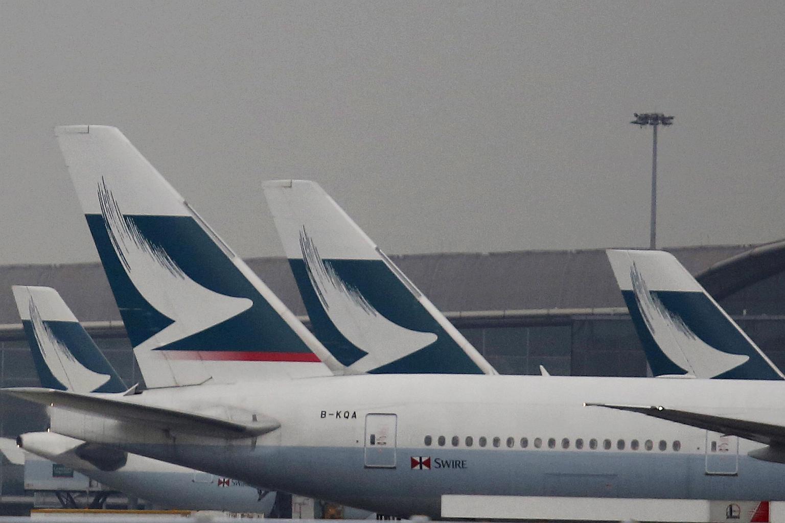 Passenger planes of Cathay Pacific Airways park at the Hong Kong Airport terminal in Hong Kong.