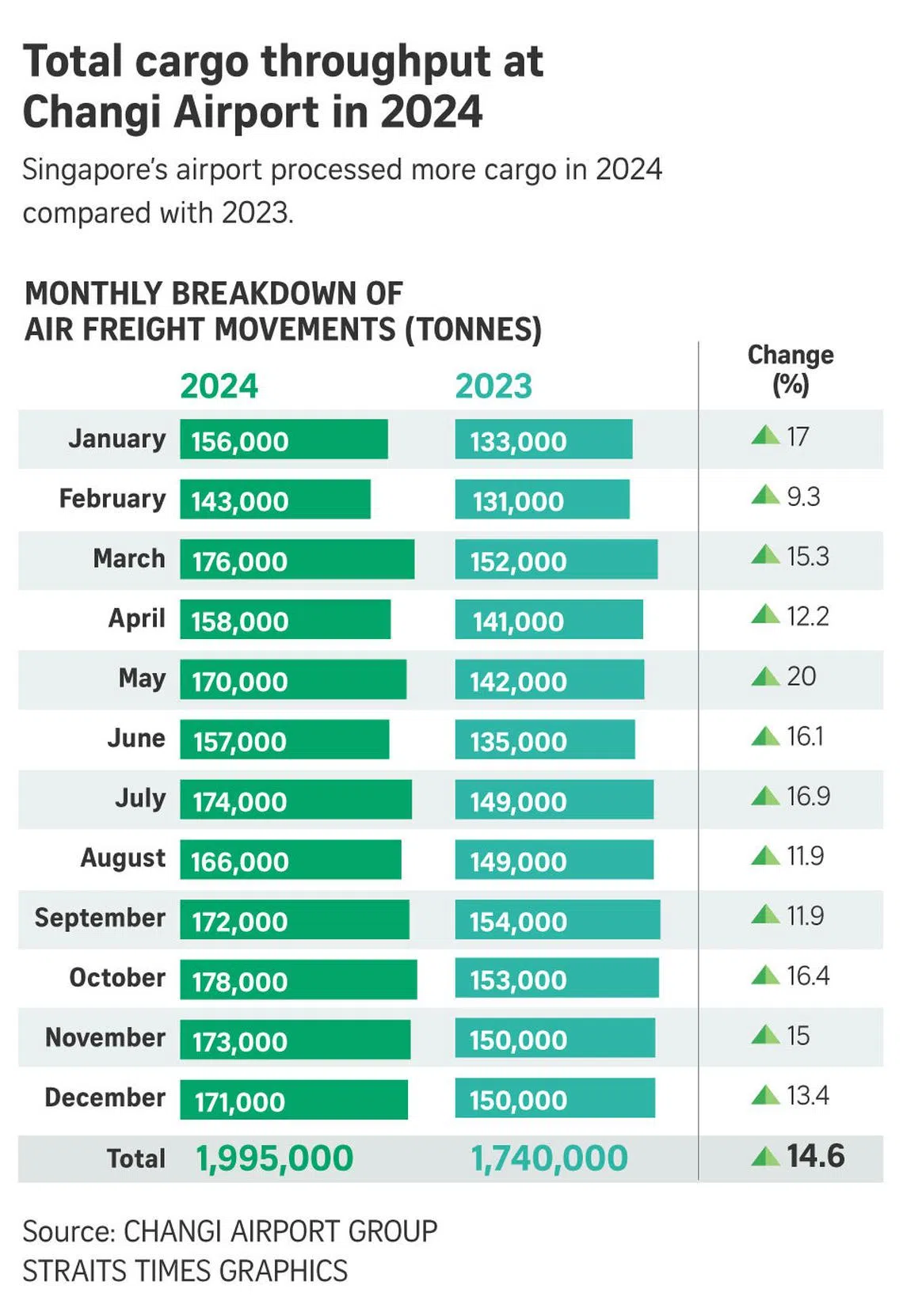 Changi Airport Group (CAG) reported on Jan 23 that it handled 1.99 million tonnes of airfreight, up 14.6 per cent from the 1.74 million tonnes in 2023. Its top five markets were China, Australia, the US, Hong Kong and India.