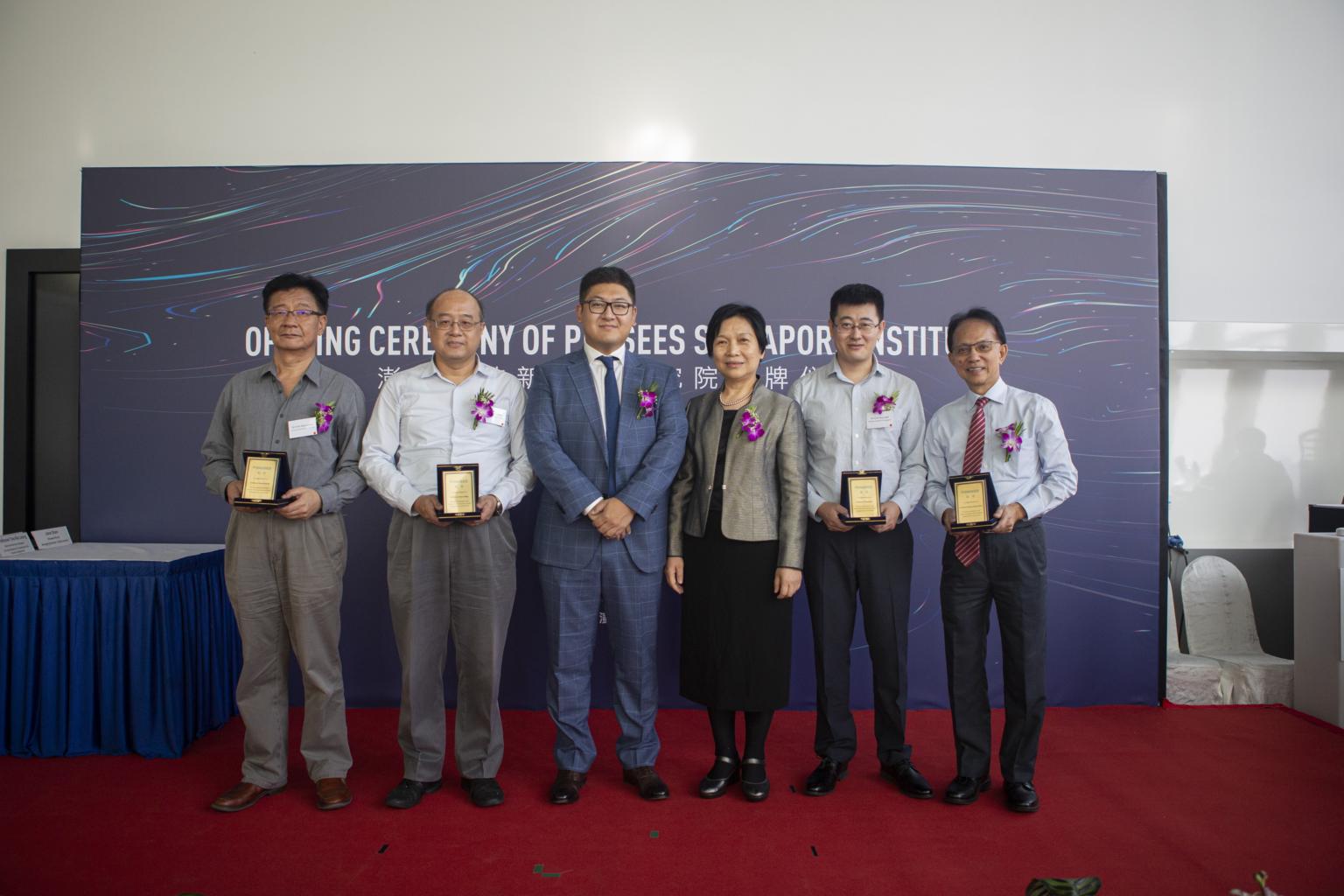 (From left) Professor Jiang Xudong, School of Electrical and Electronic Engineering, Nanyang Technological University (NTU); Professor Cheng I-Ming, School of Mechanical and Aerospace Engineering, NTU; Mr Ma Yuan, founder and chief executive officer, Pensees; Ms Jane Shen, group chief scientist and managing director, Pensees; Dr Feng Jiashi, Department of Electrical and Computer Engineering and head, Learning and Vision Lab, NUS; and Professor Hang Chang Chieh, executive director, Institute for Engineering Leadership, NUS, at the unveiling of the Pensees Singapore Institute on July 31, 2019.