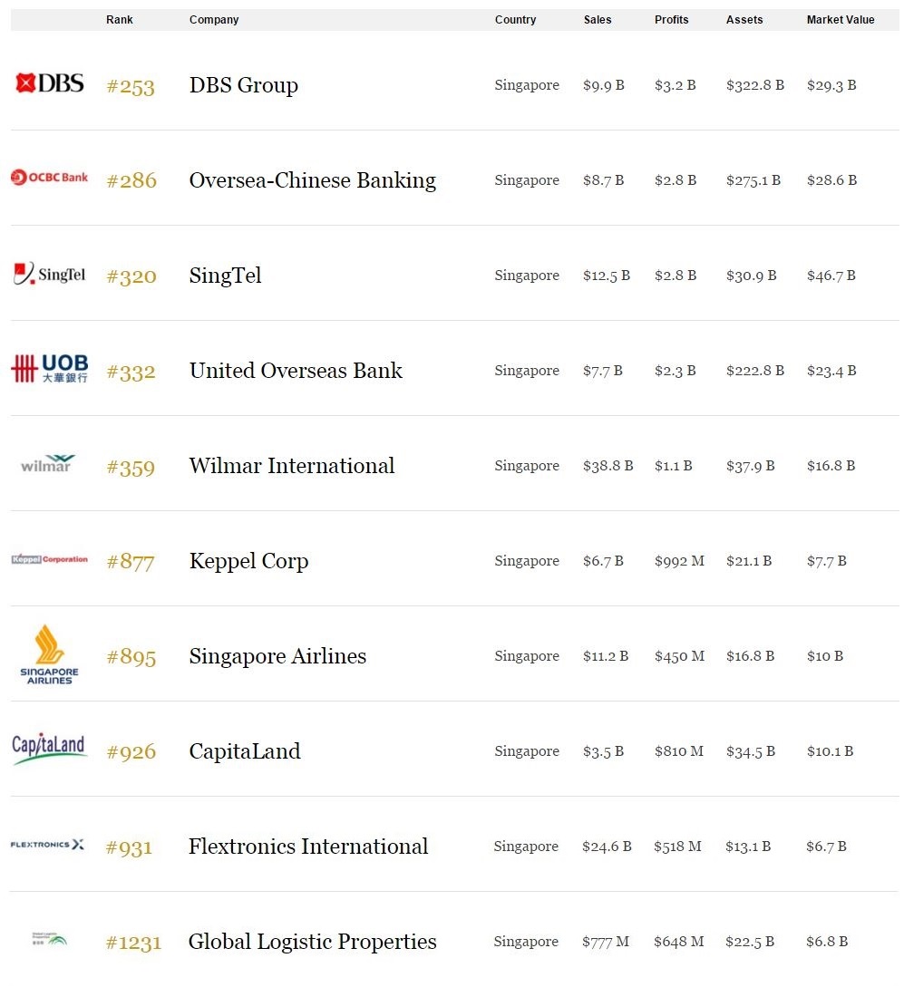17 Singapore firms make Forbes list of the world's biggest public companies, down by 3