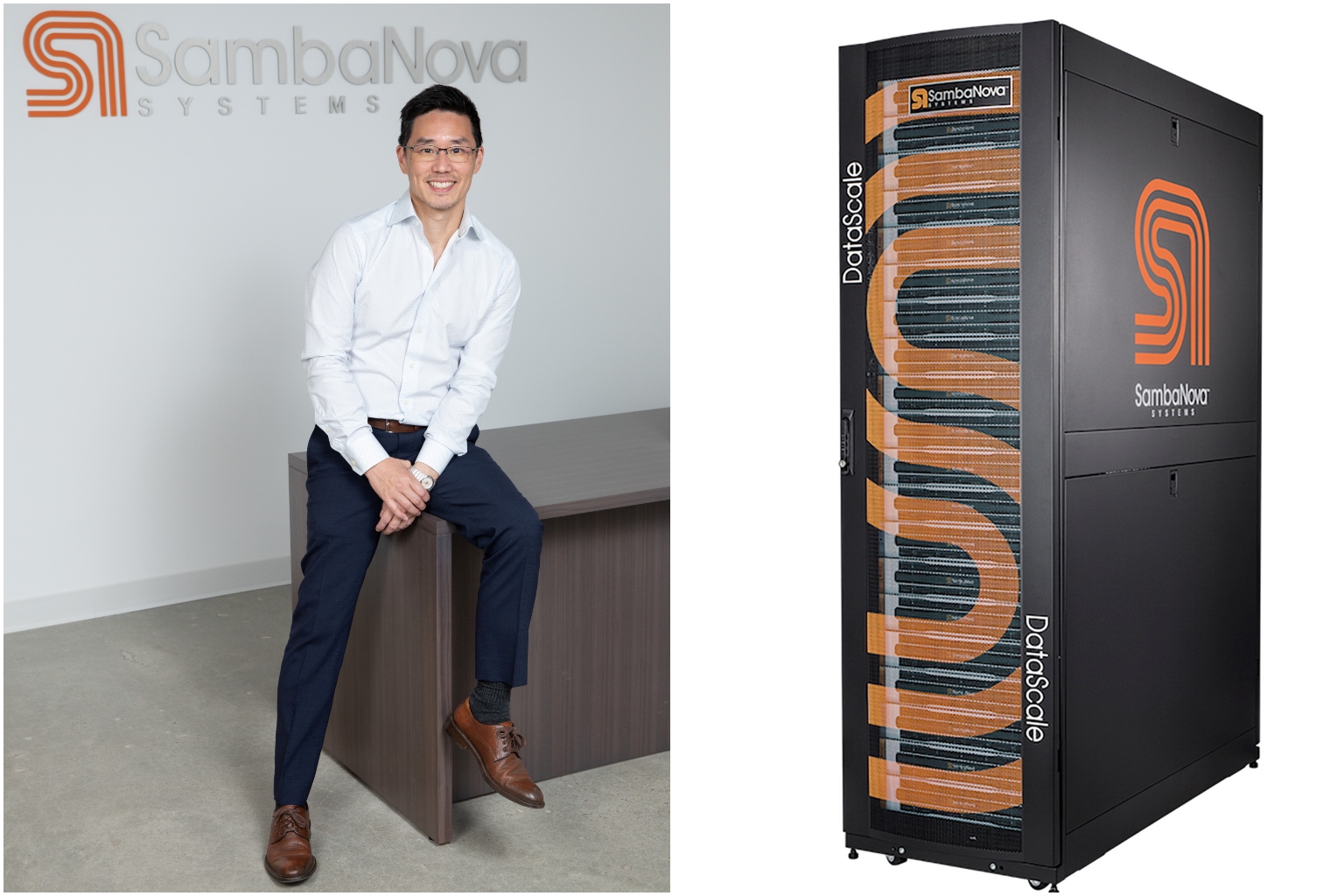 CEO of SambaNova Systems Rodrigo Liang (left) and a data center server rack.