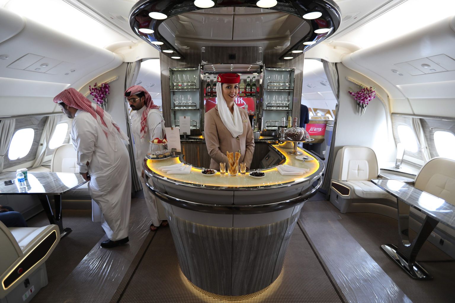 People walk inside the 100th Emirates double-decker Airbus A380 in November 2018.