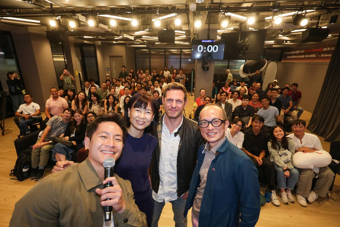 (Front from left) Money FM presenter Dan Koh, ST senior business correspondent Krist Boo, partner and career business leader of Mercer Singapore Lewis Garrad and assistant chief executive of transformation support group at Workforce Singapore Brandon Lee in a group photo with the attendees at the ST Headstart x WSG event.