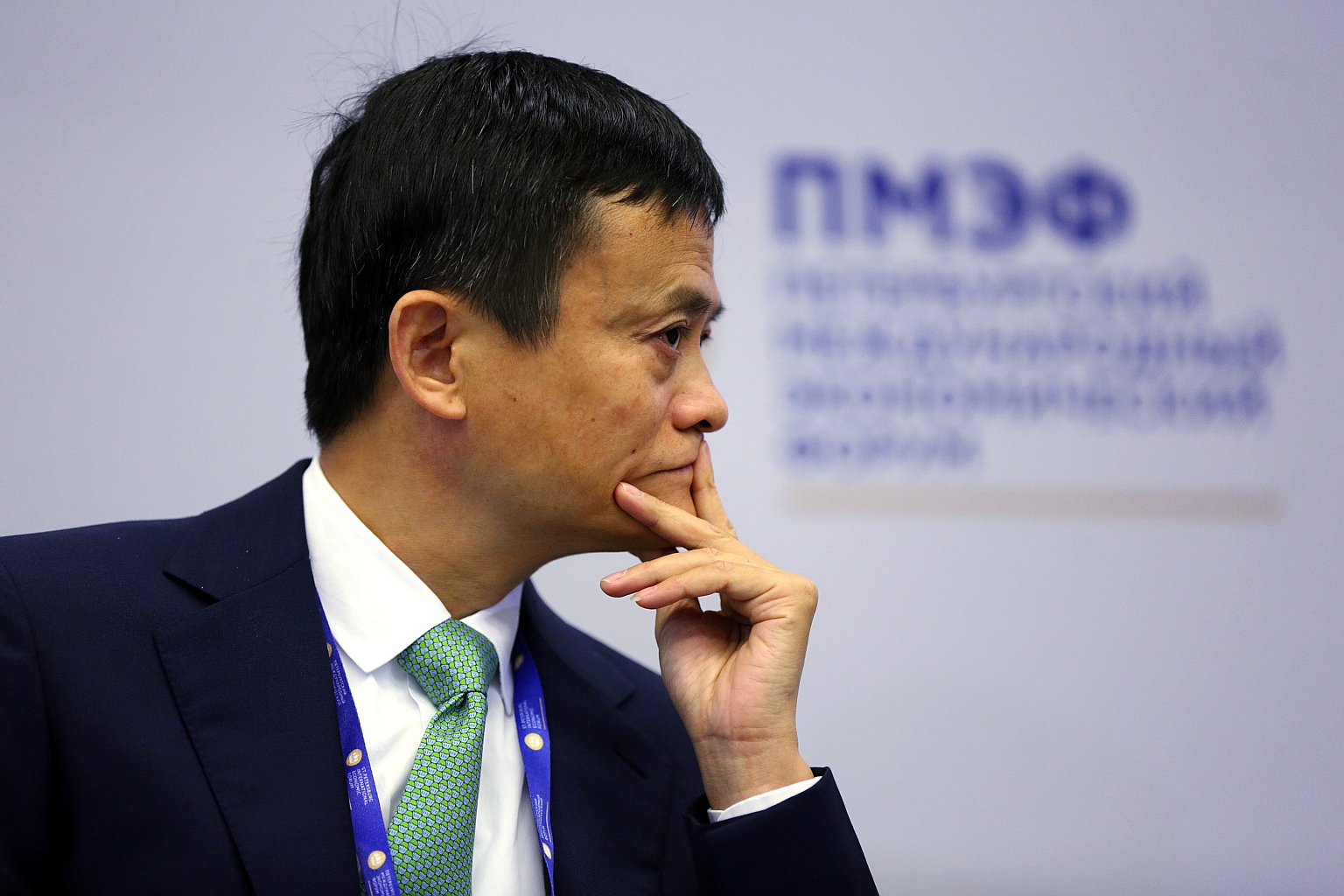 Jack Ma, billionaire and chairman of Alibaba Group Holding Ltd., pauses during a panel session on the opening day of the St. Petersburg International Economic Forum 2016.