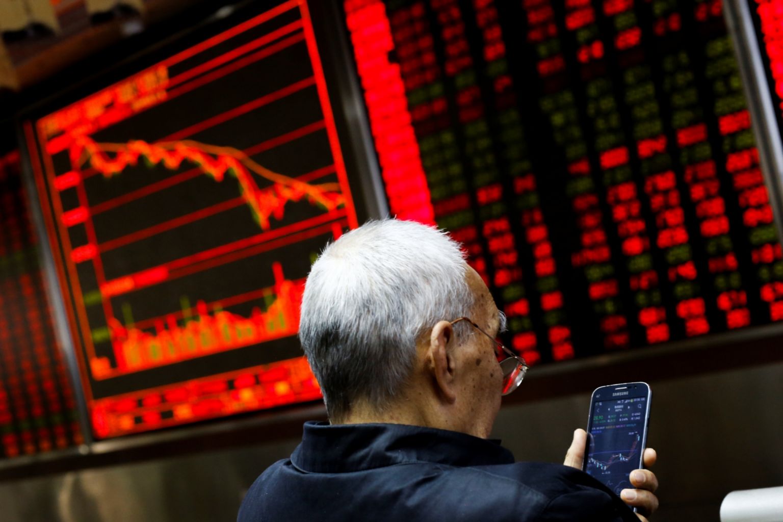 An investor sits in front of a board showing stock information at a brokerage office in Beijing, China, on Dece 7, 2018.