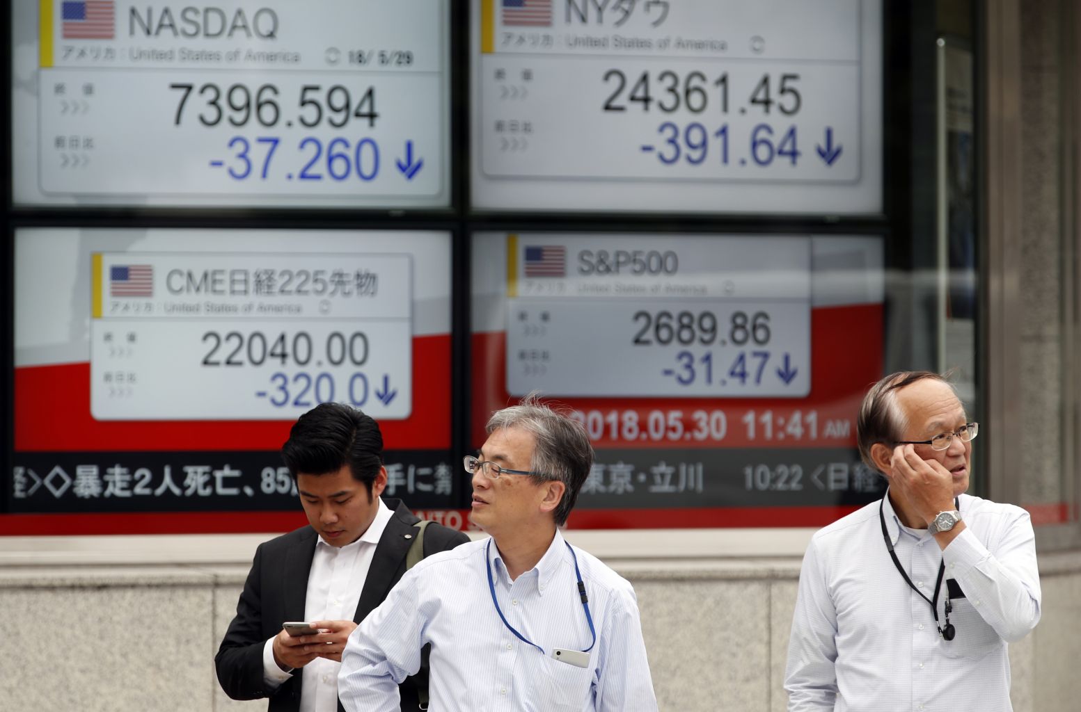 Pedestrians stand before a stock market indicator board in Tokyo, Japan, on May 30, 2018