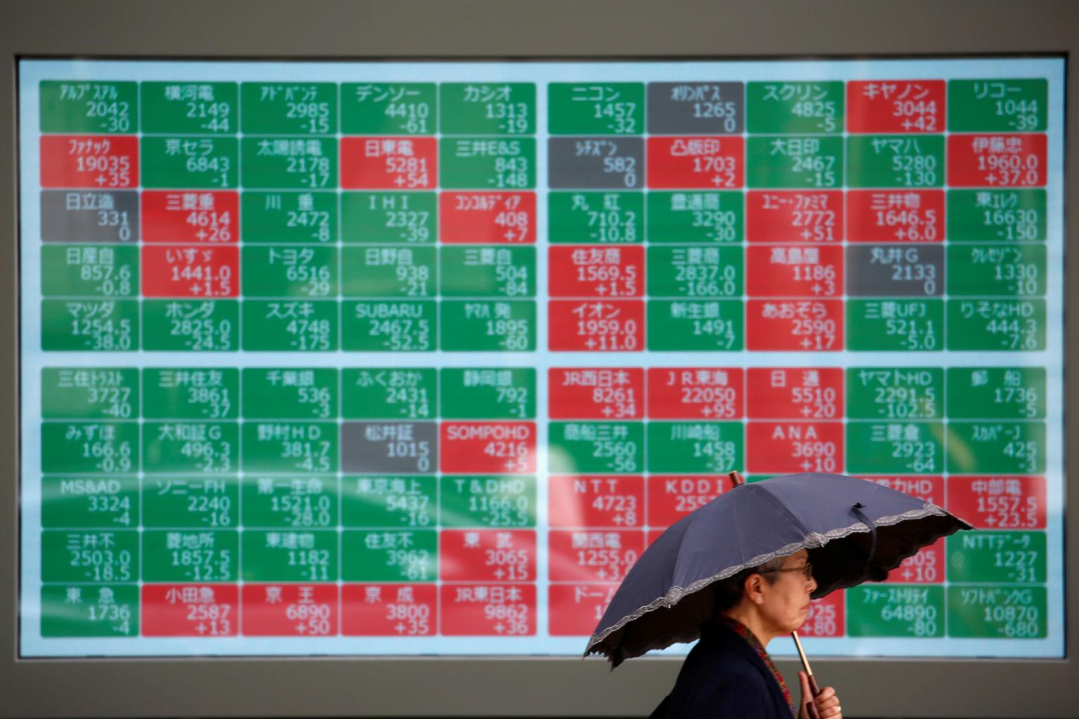 A passerby walks past in front of a stock quotation board outside a brokerage in Tokyo, Japan, on May 10, 2019.