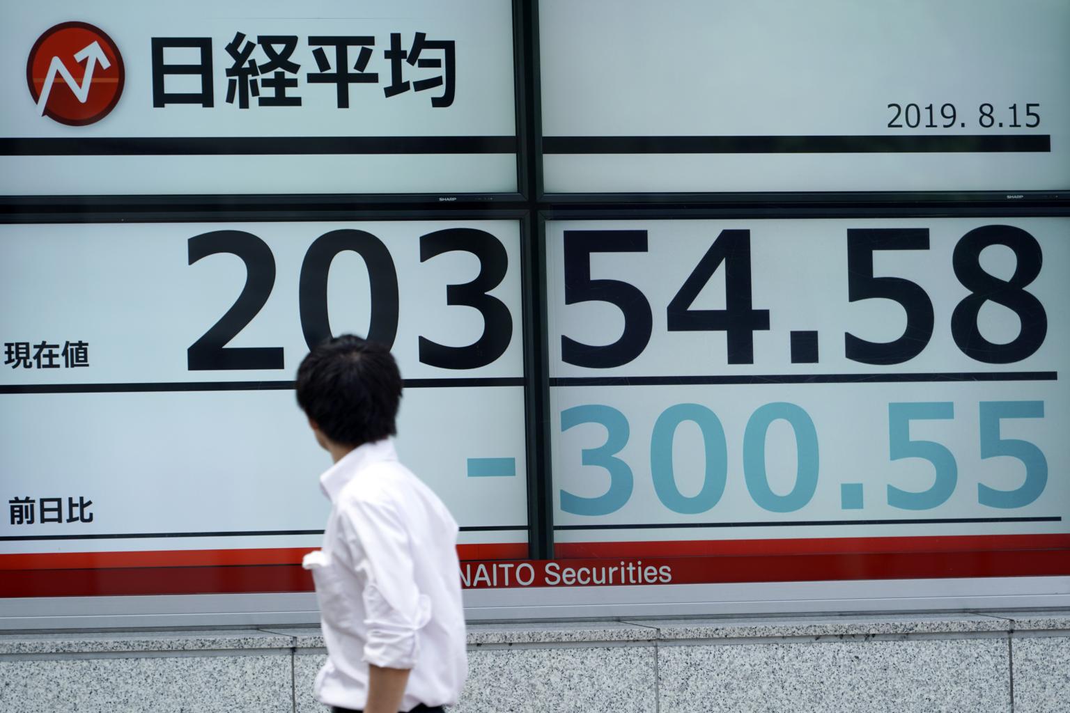 A man looks at an electronic stock board showing Japan's Nikkei index at a securities firm in Tokyo on Aug 15, 2019.