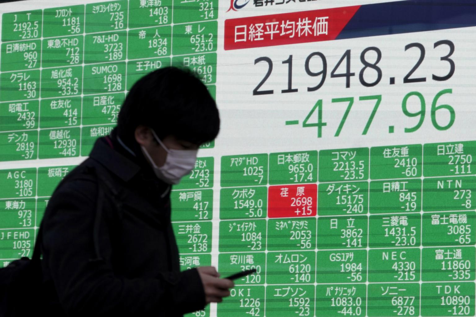 A pedestrian walks past a display showing closing information of Tokyo's Nikkei Stock Average outside a securities office, on Feb 27, 2020.