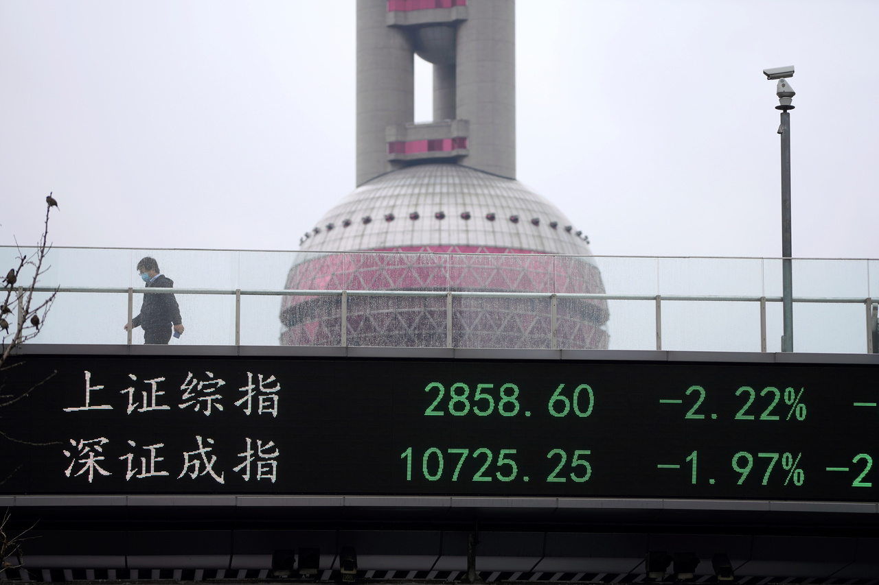A man wearing a face mask walks by an electronic board showing the Shanghai and Shenzhen stock indexes, in Shanghai, China, on March 13, 2020.