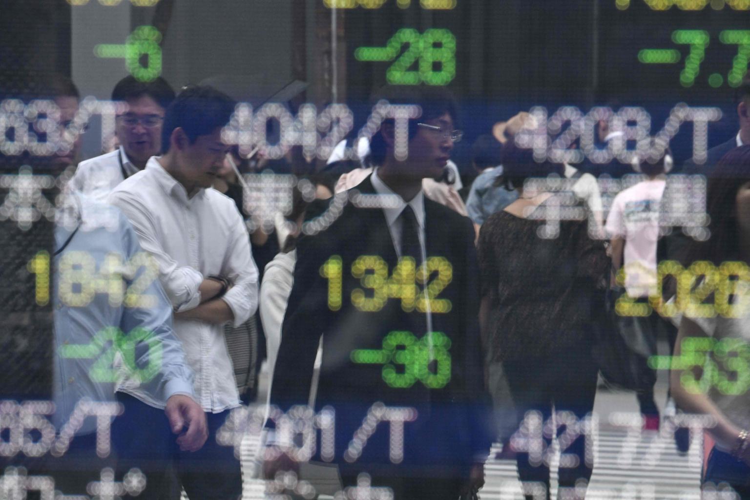 Pedestrians are reflected on an electronics stock indicator at the window of a securities company in Tokyo, on June 3, 2019.