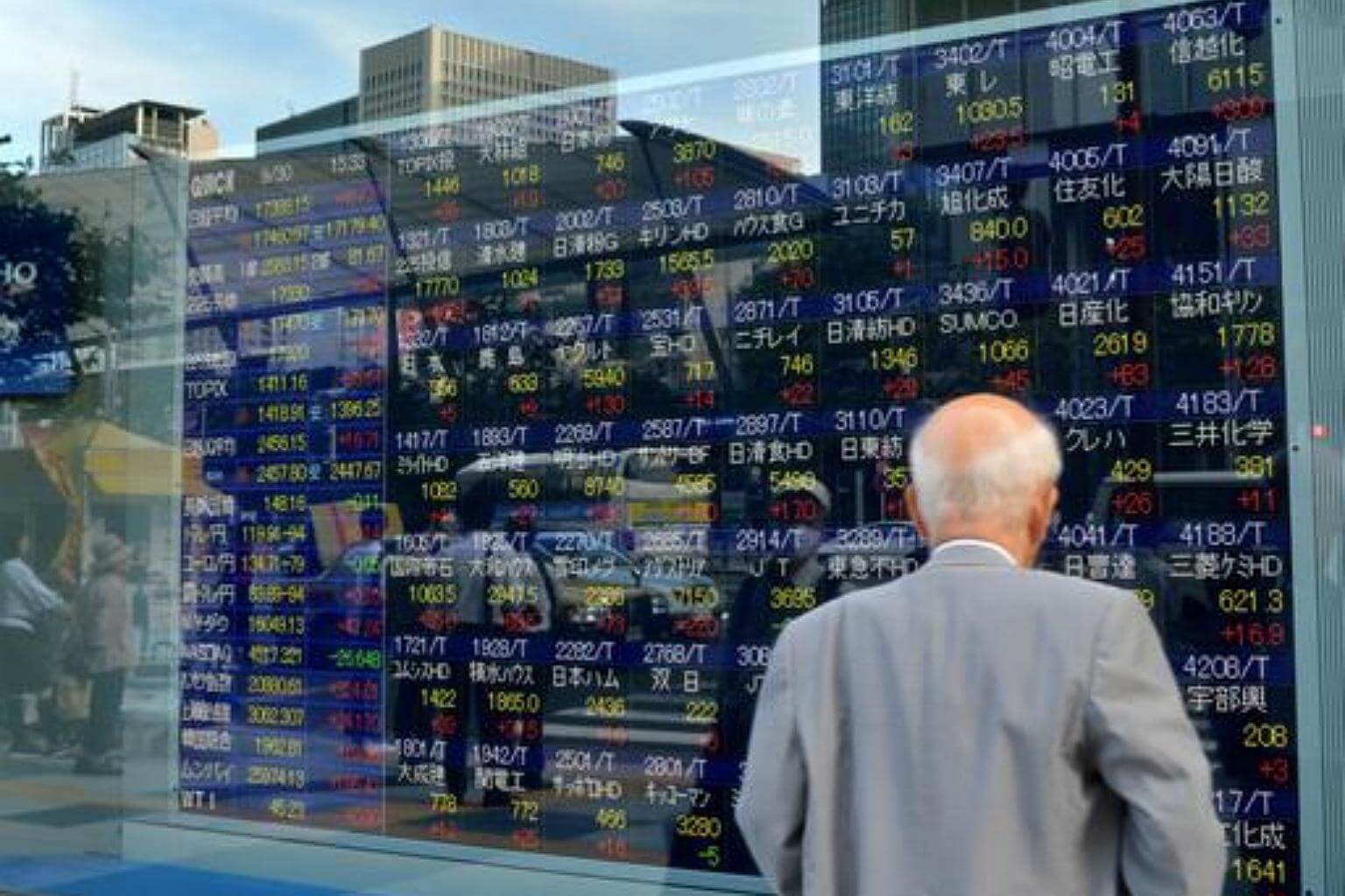 A man looks at a stock prices board showing the numbers on the Nikkei 225 at the Tokyo Stock Exchange.