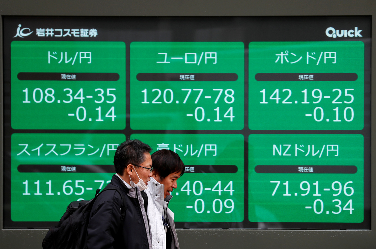Men walk past an electronic display showing the Japanese yen's exchange rates against world currencies in Tokyo on Jan 8, 2020.