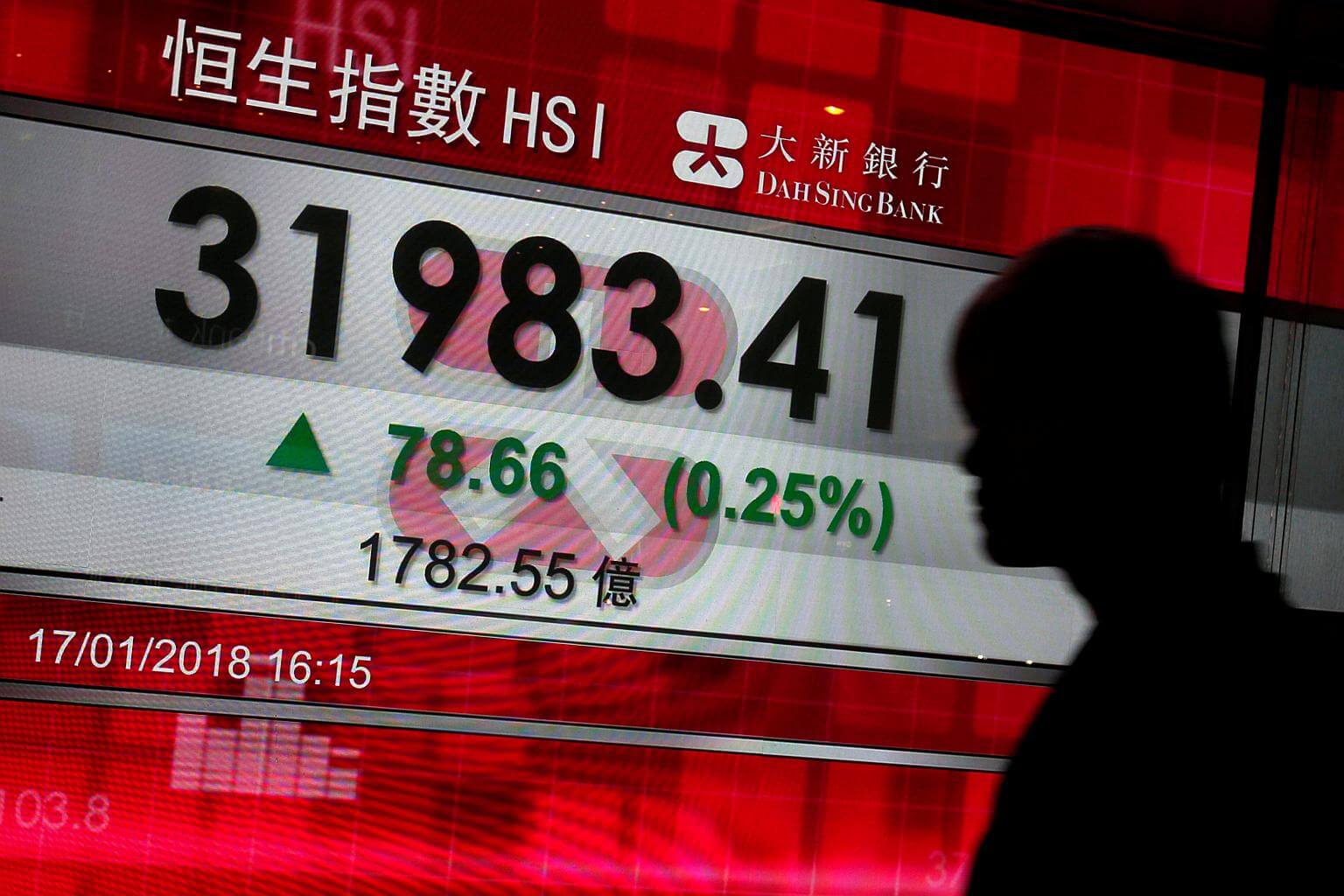 A man walks past a panel displaying the fresh closing peak Hang Seng Index in Hong Kong on Jan 17, 2018.