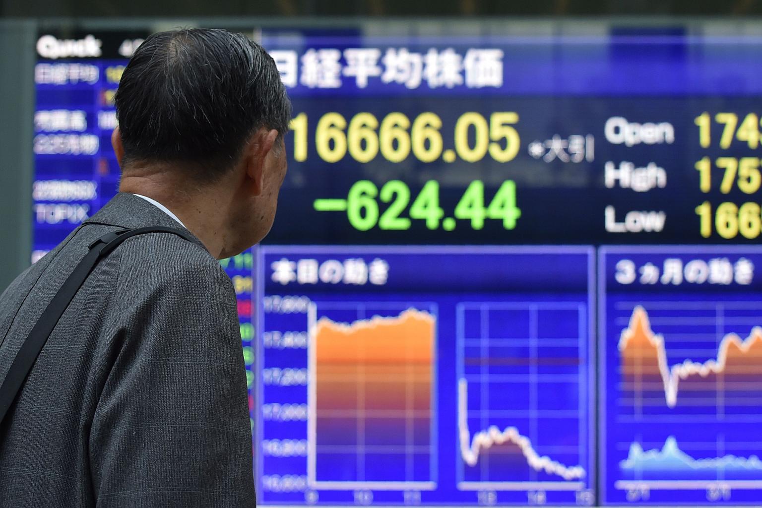 A pedestrian looks at a quotation board flashing the Nikkei key index from the Tokyo Stock Exchange in Tokyo.