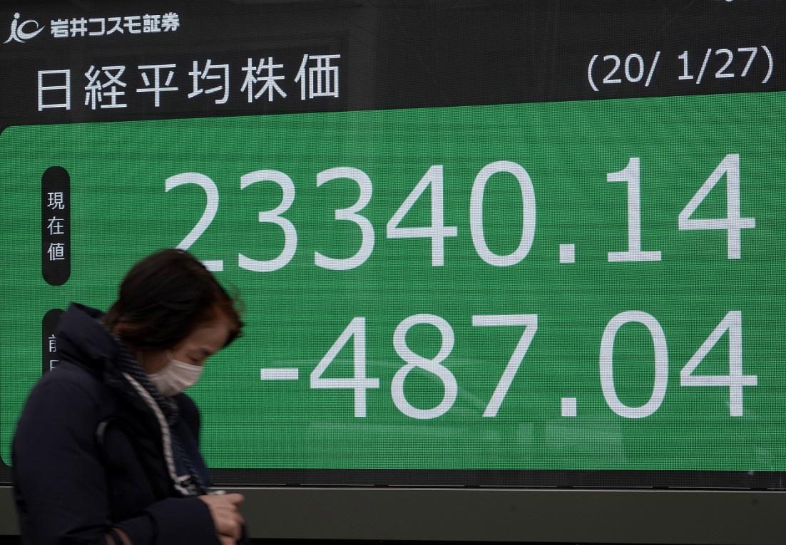 A woman walks past a display showing Tokyo's Nikkei stock average on Jan 27, 2020.
