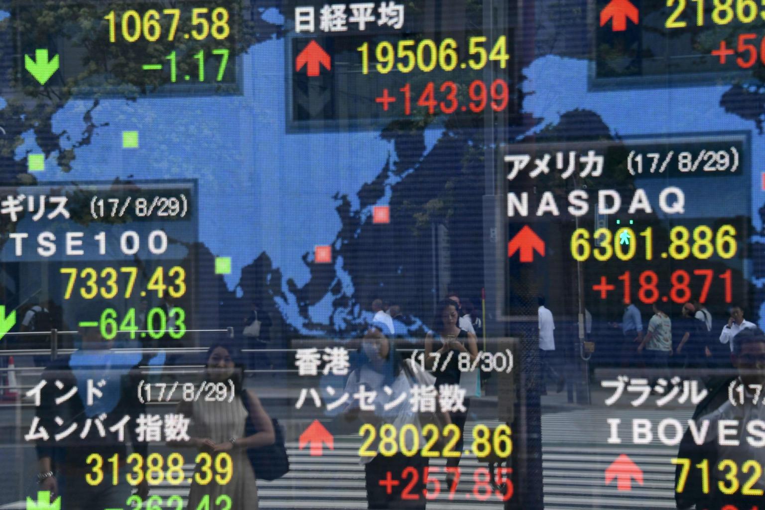 An electronic stock indicator at the window of a securities company in Tokyo on Aug 30, 2017.