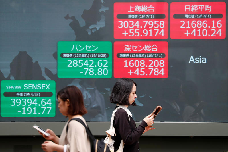 An electric screen showing Asian markets indices outside a brokerage in Tokyo on July 1, 2019.