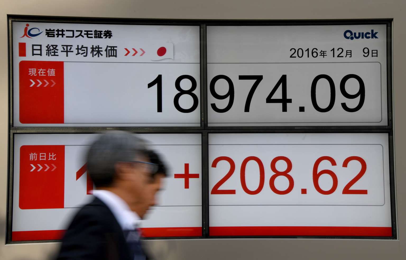 Businessmen walk past the electronics stock indicator displaying the morning session closing rate in Tokyo.