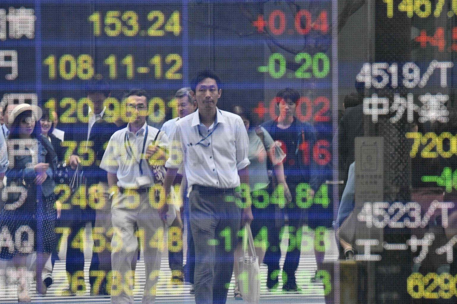 Pedestrians are reflected on an electronics stock indicator at the window of a securities company in Tokyo, on June 3, 2019.