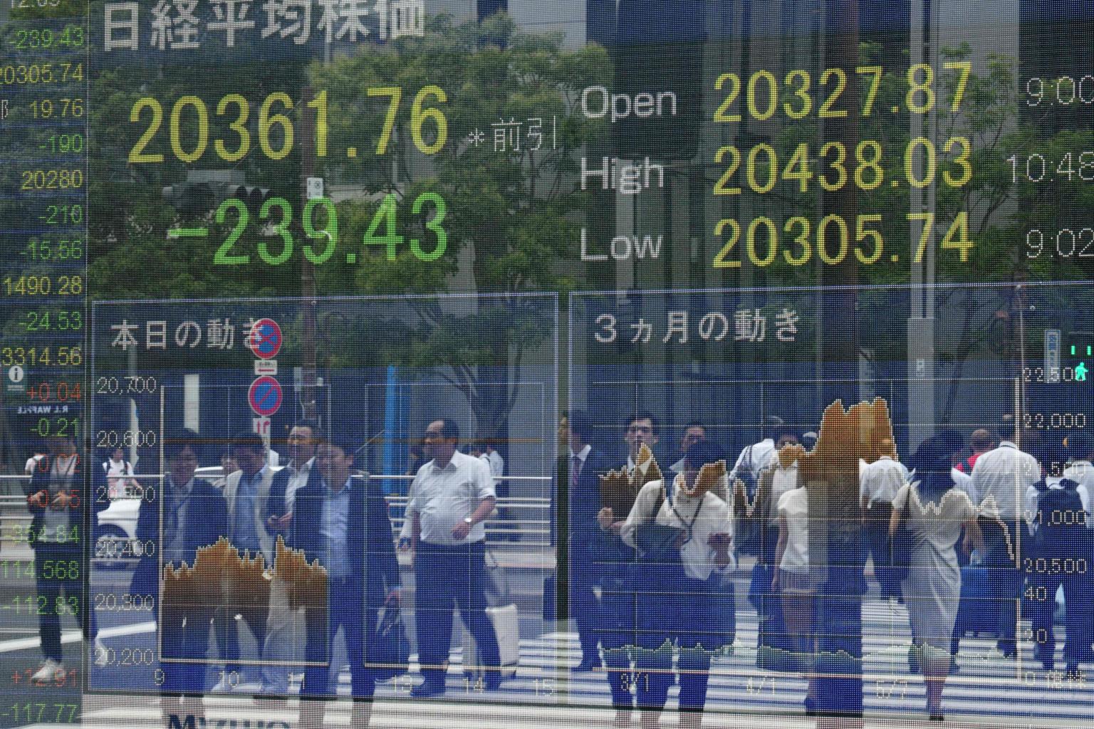 Pedestrians are reflected on an electronics stock indicator at the window of a securities company in Tokyo, on June 3, 2019.