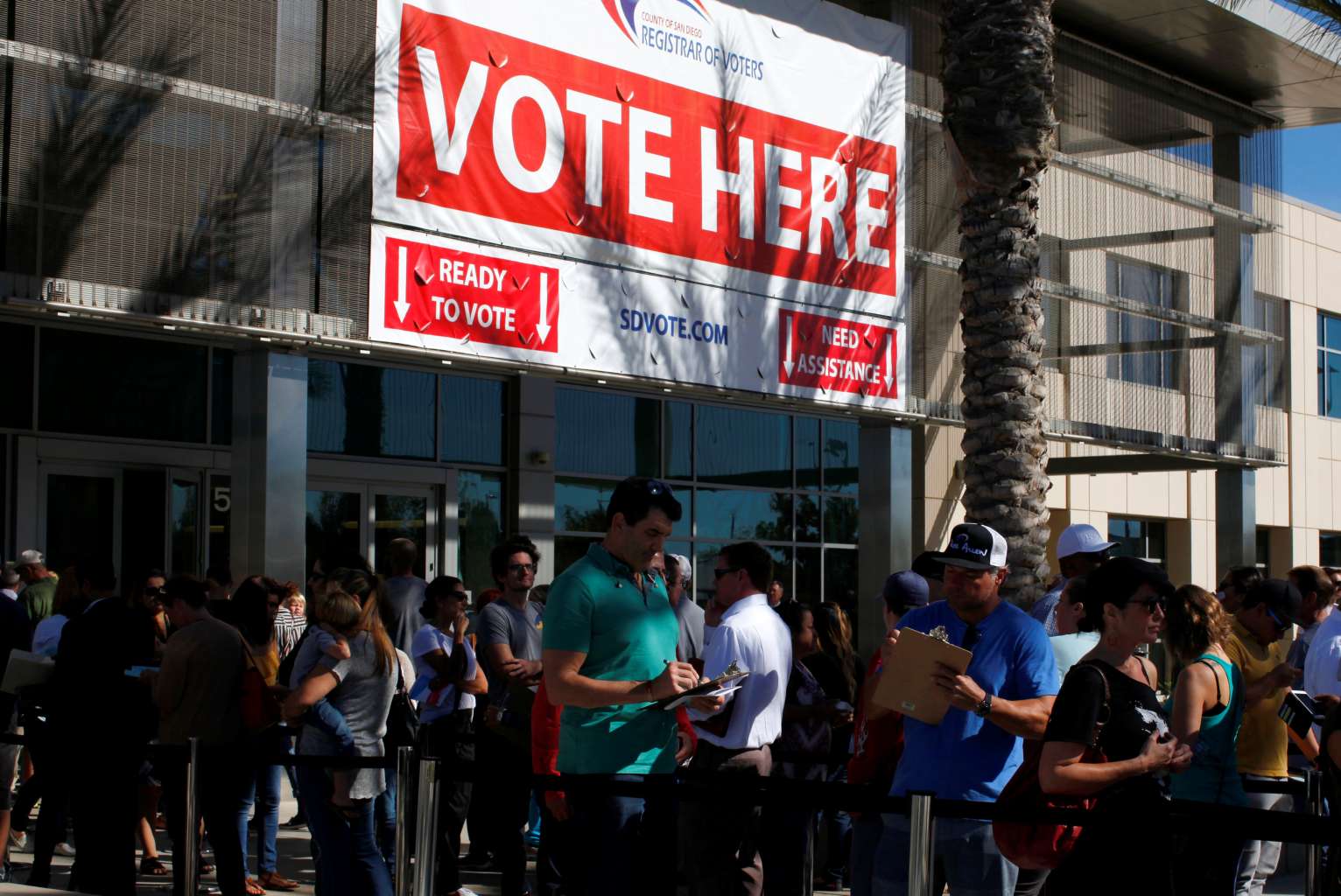 People line up to vote early outside the San Diego County Elections Office in San Diego.