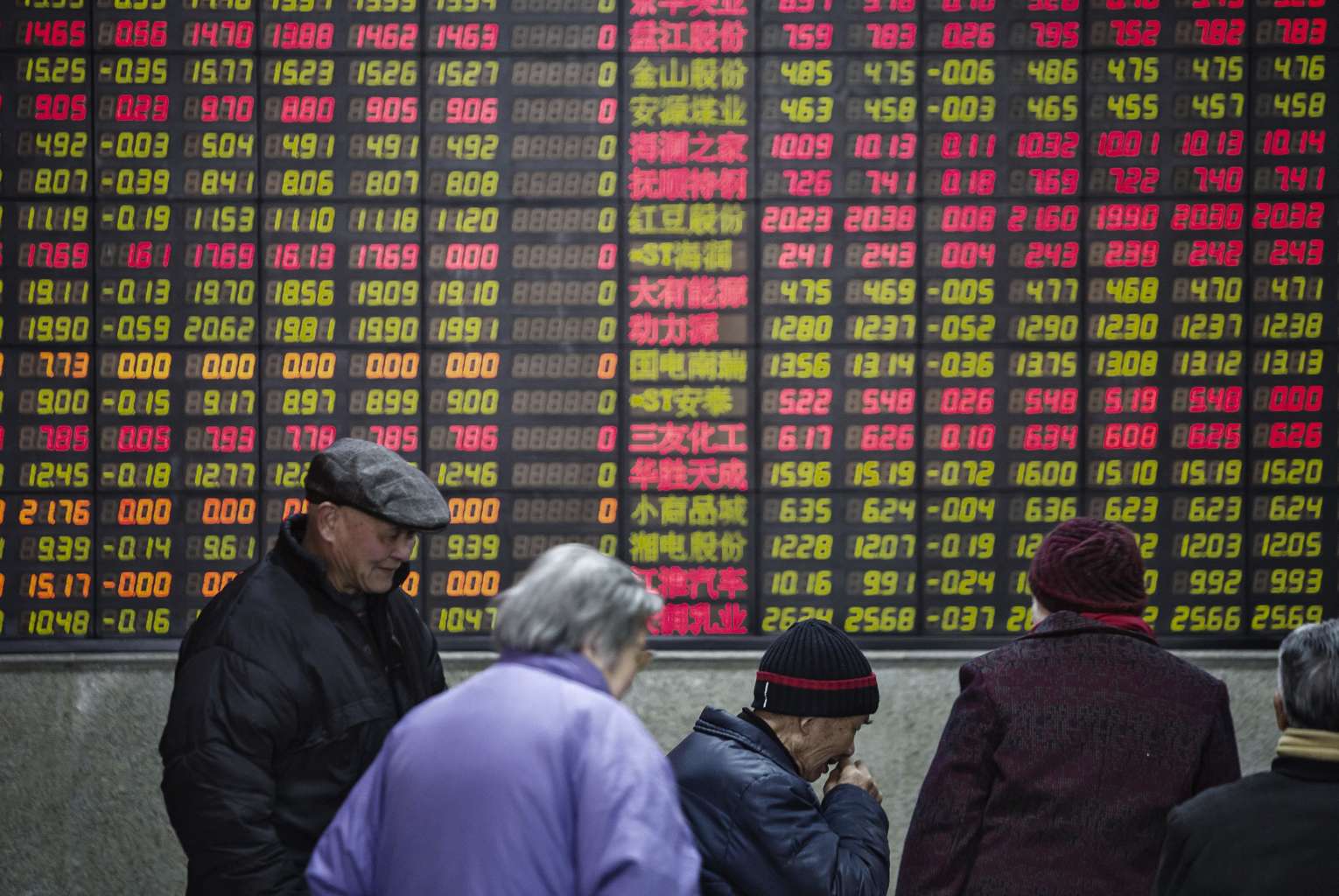 People stand in front of an electronic board displaying share prices at a securities exchange house in Shanghai.