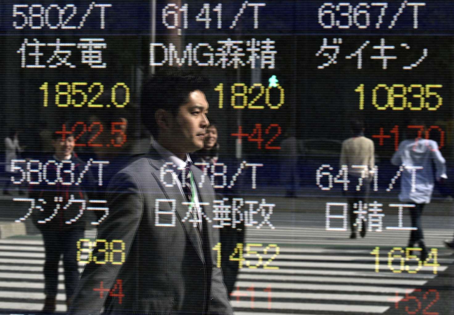 Pedestrians are reflected in a stock market indicator board in Tokyo, Japan.