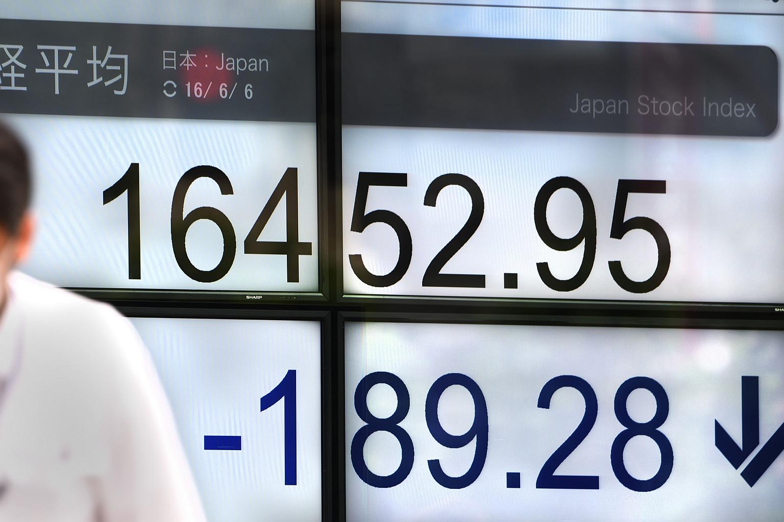 A man walks past the Nikkei key index of the Tokyo Stock Exchange in front of a securities company in Tokyo on June 6.