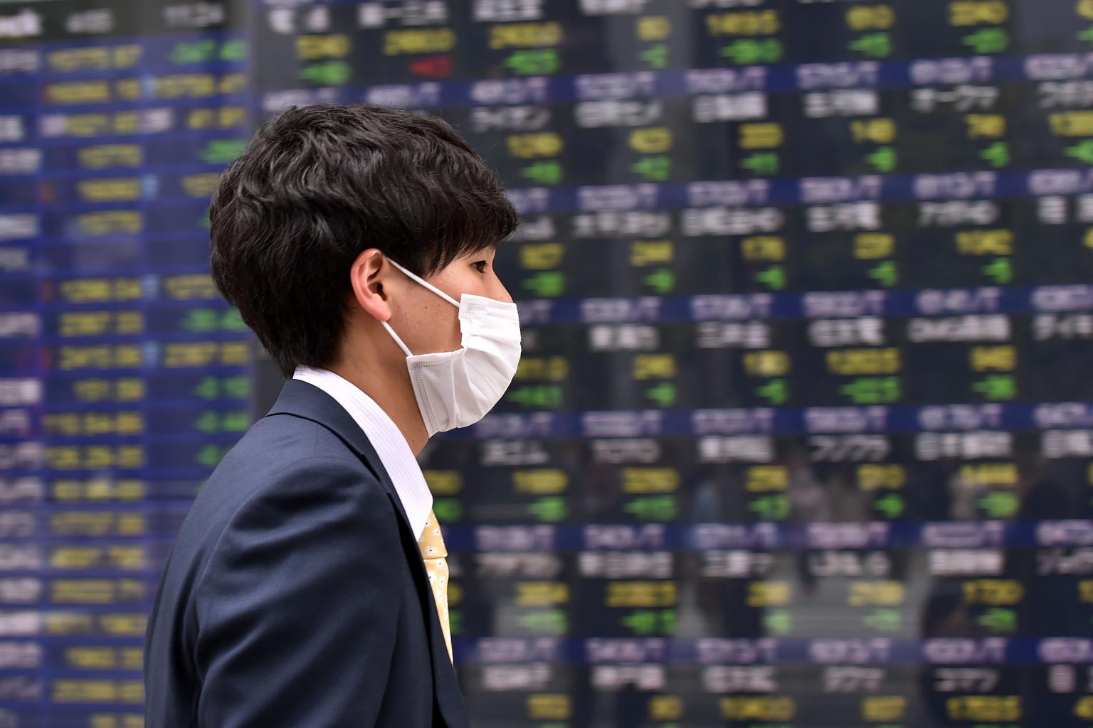 A pedestrian walks past a share prices board of the Tokyo Stock Exchange in Tokyo on April 5, 2016.