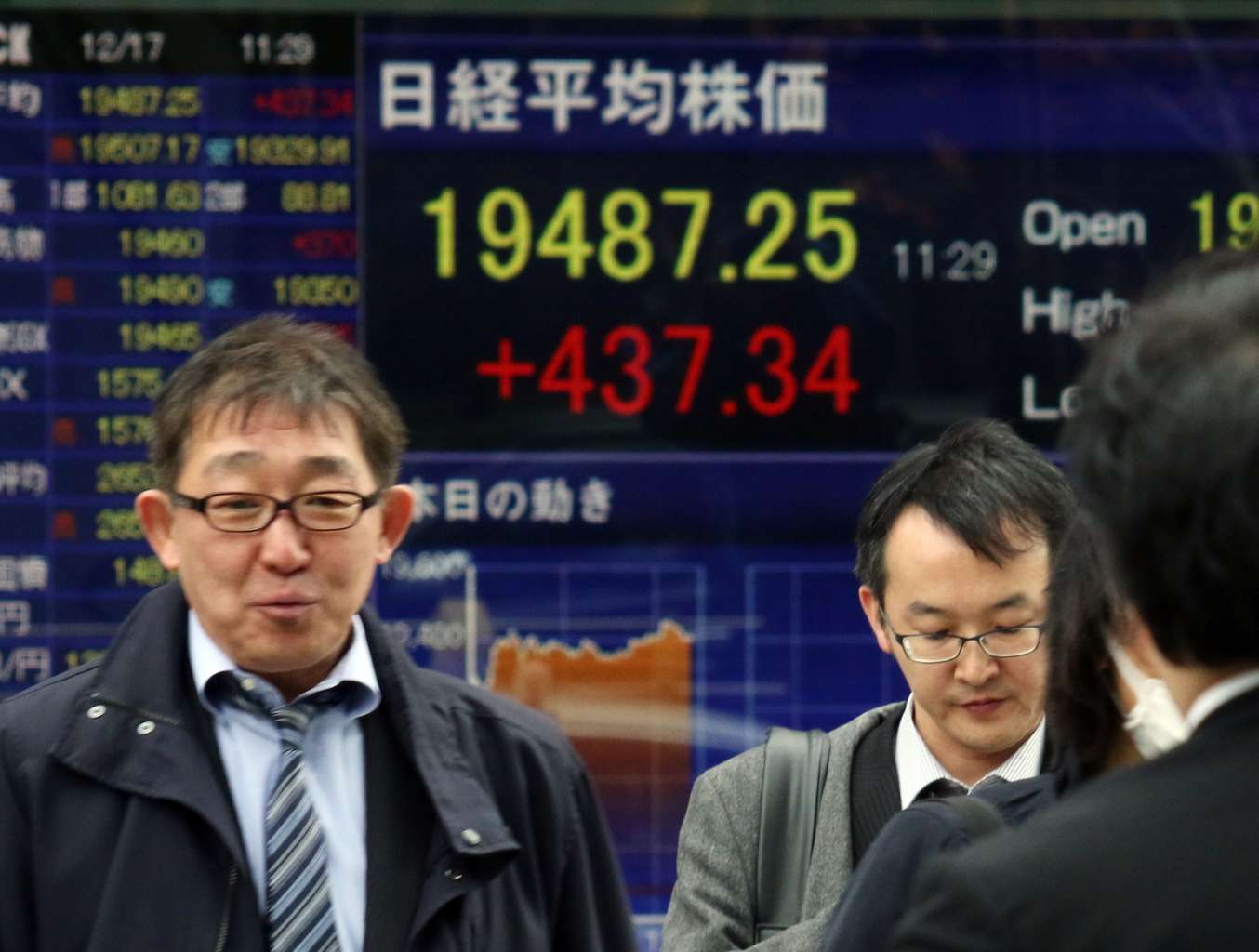 Pedestrians walk past a share prices board showing the early numbers on the Tokyo Stock Exchange in Tokyo on Dec 17, 2015.
