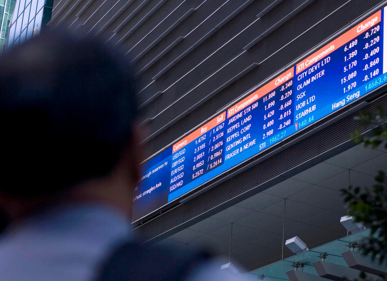 File picture of an electronic stock quotation board on the side of a building in Singapore's financial district.
