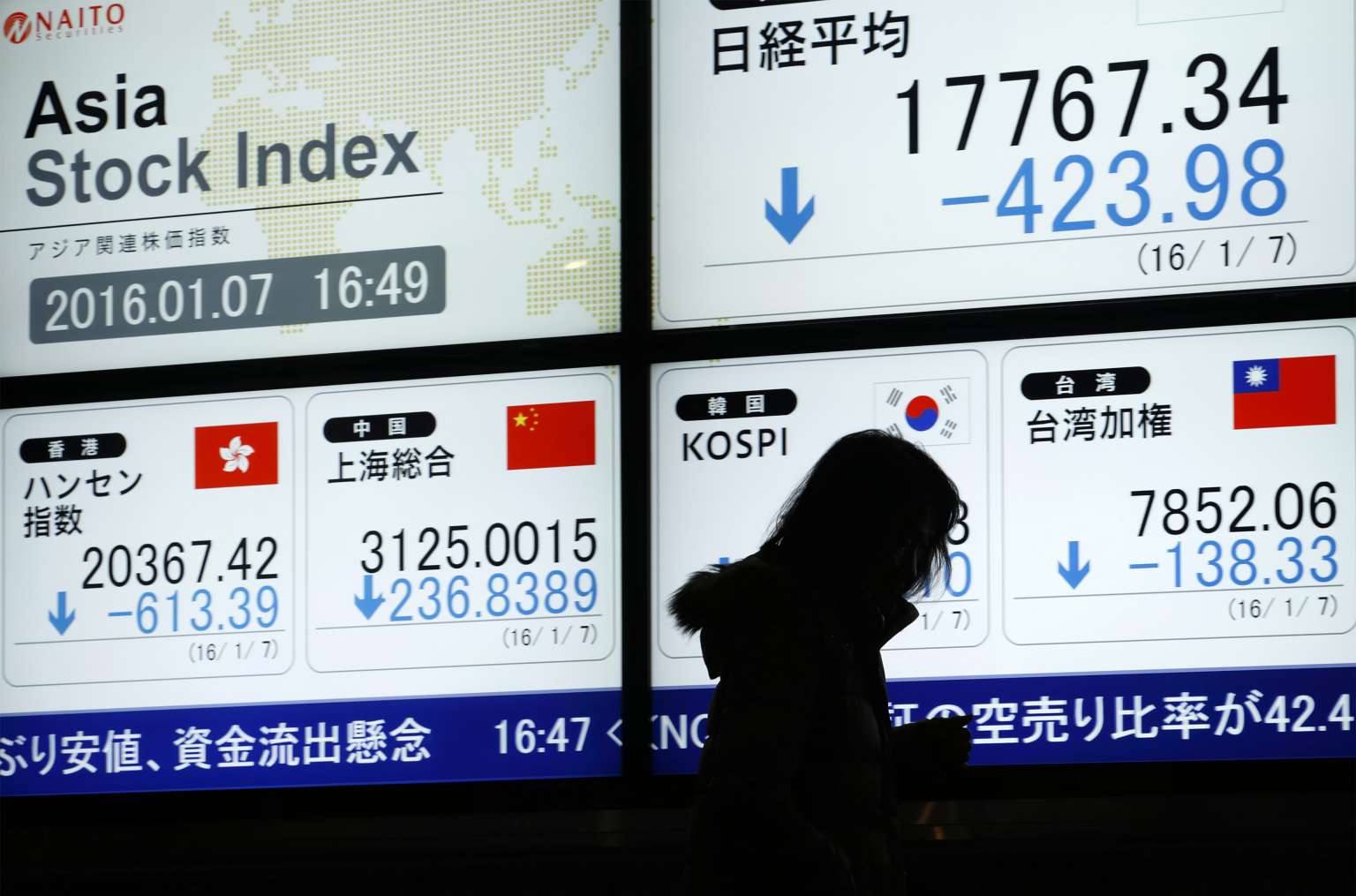 A pedestrian walking past an electronic stock board outside a securities firm in Tokyo on Jan 7.
