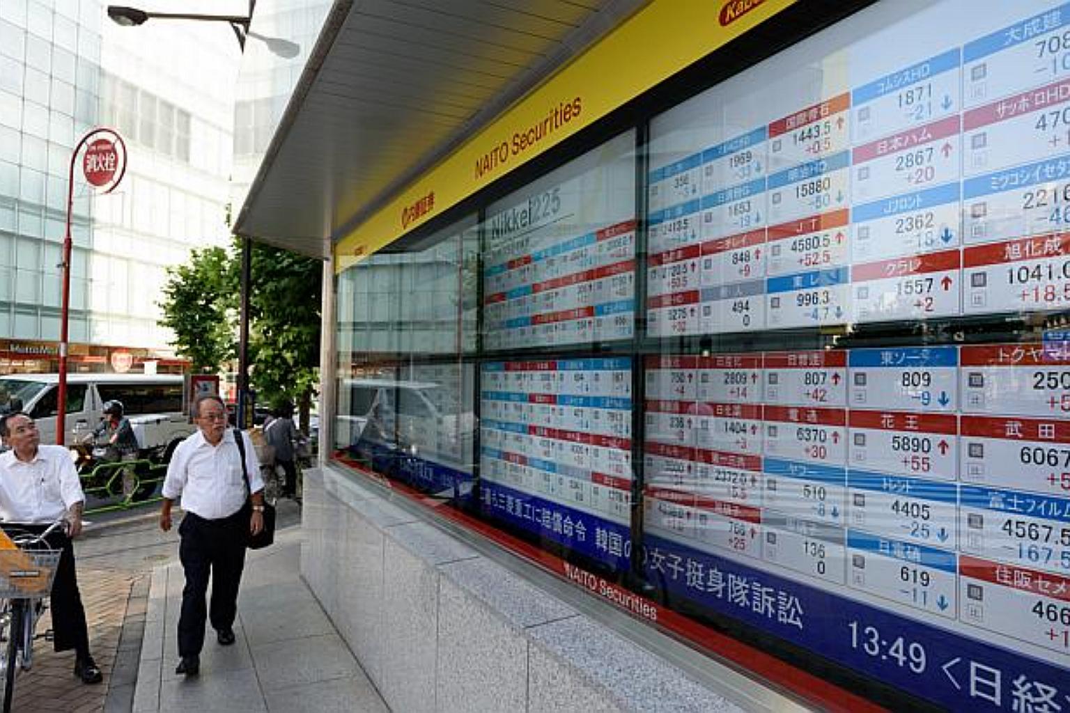 Pedestrians look at an electronic stock board outside a securities firm in Tokyo, Japan, on June 24, 2015.