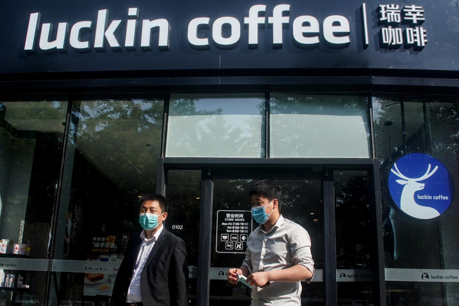 People walk out of a branch of Luckin coffee in Beijing on May 20, 2020.