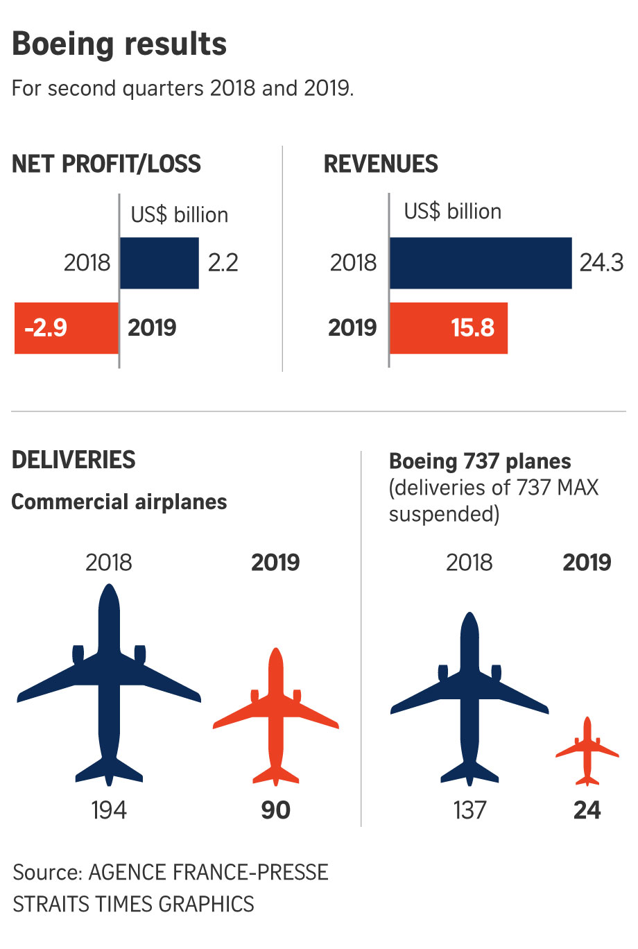NEW YORK (AFP) - Boeing reported its biggest loss on Wednesday (July 24) as the 737 Max crisis drags on, and the company warned that it could be forced to temporarily halt production of the plane if the grounding is extended much longer.