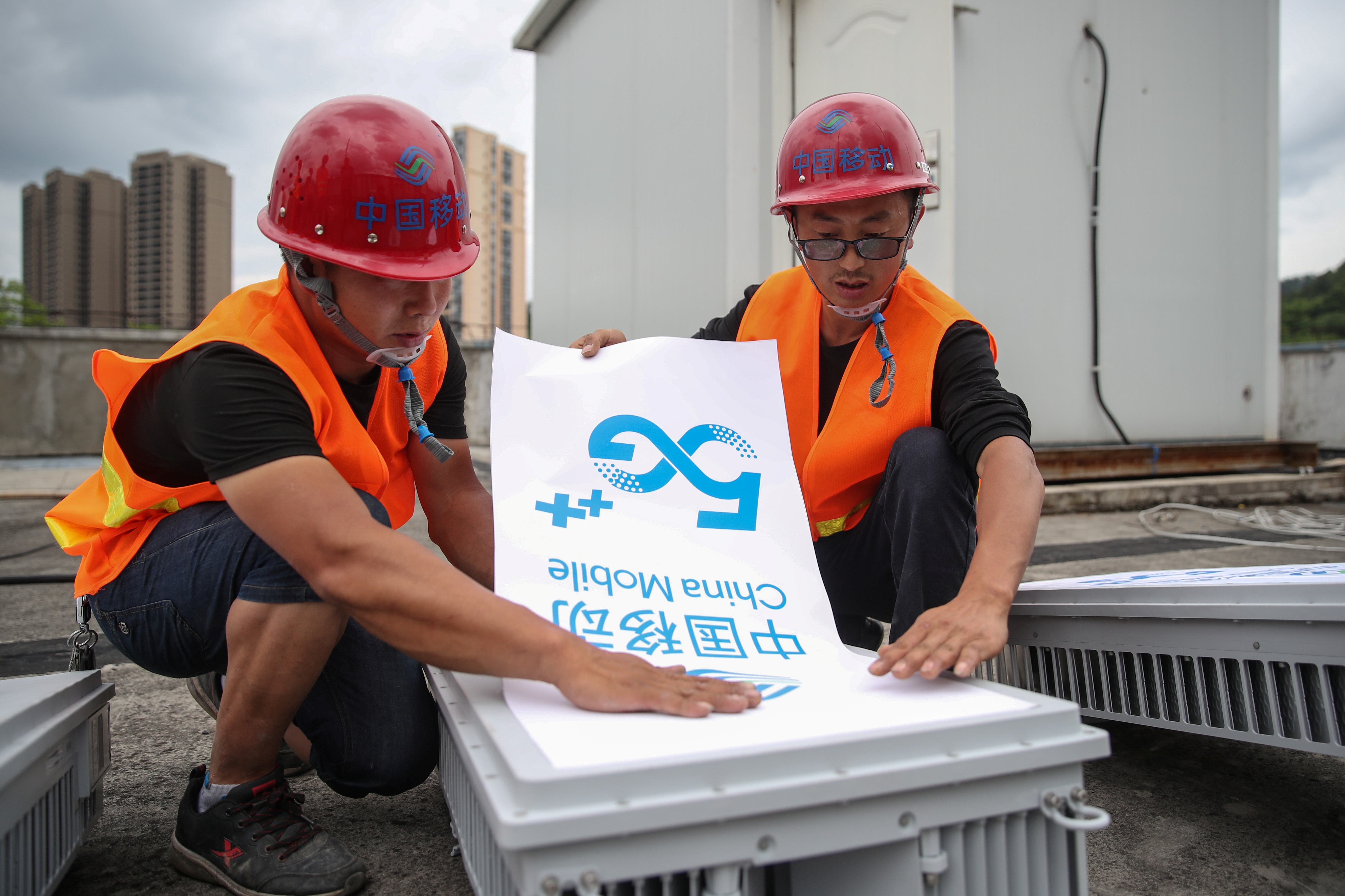 Workers placing a China Mobile 5G sign on equipment at a 5G base station in Fenggang, Guizhou province.