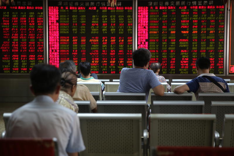 Chinese investors watching an electronic board showing the stock index and prices at a securities brokerage house in Beijing on June 26, 2018.