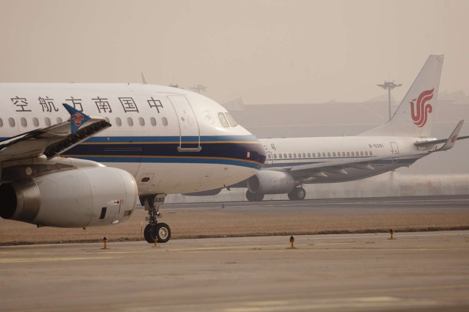 A China Southern Airlines jet (left), taxis past an Air China jet at Beijing Capital International Airport.